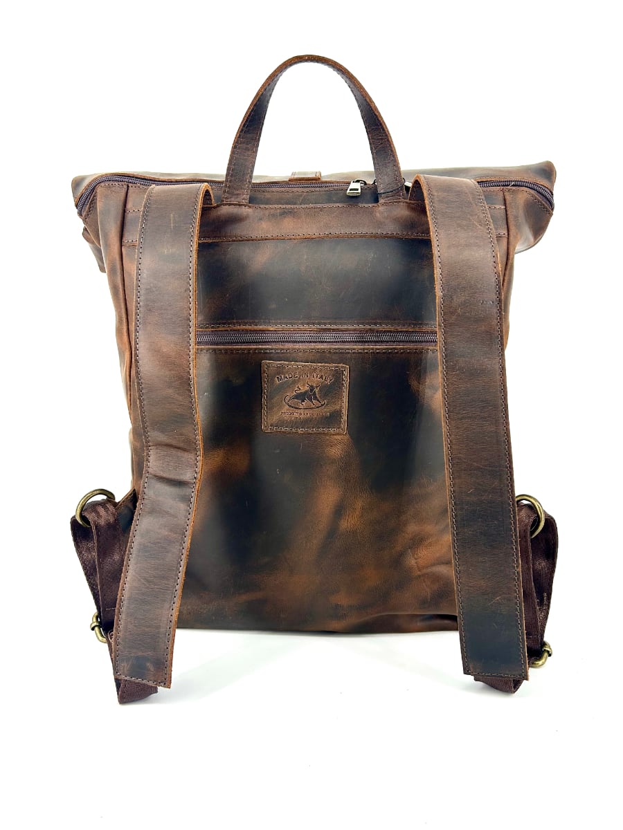 Handcrafted in Italy from tough-yet-supple genuine calf leather, it features a rolled-top closure, padded straps, and smart pockets for effortless organization.