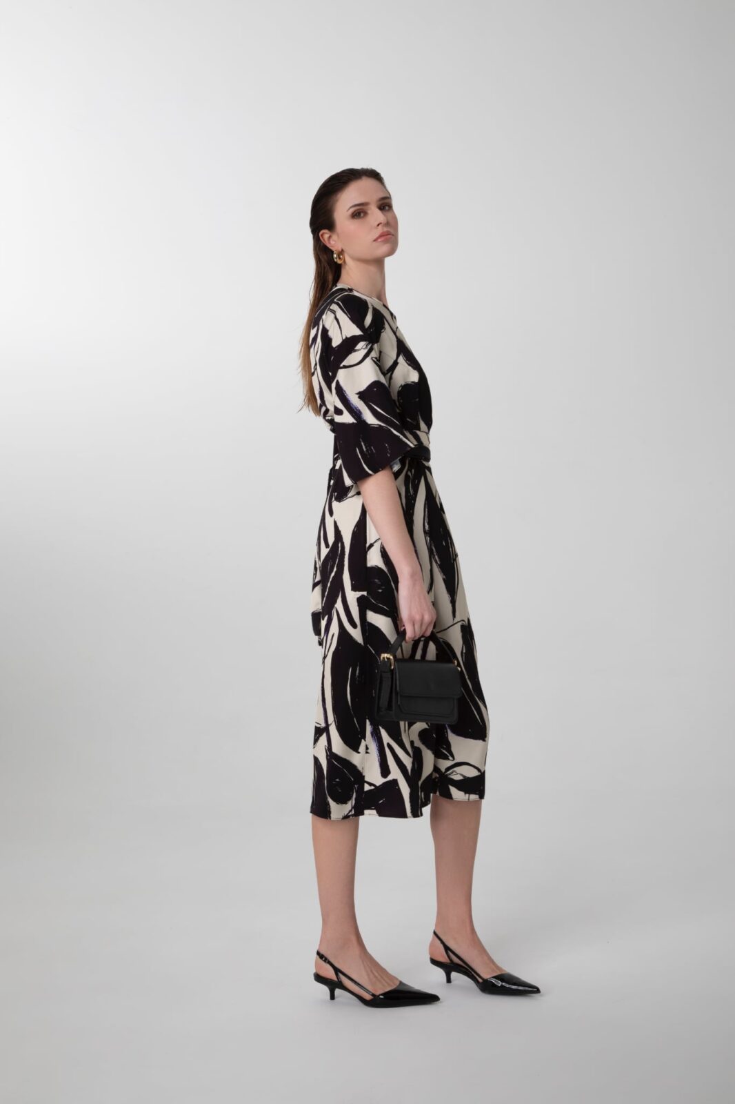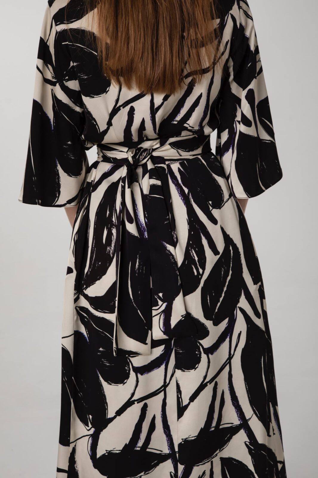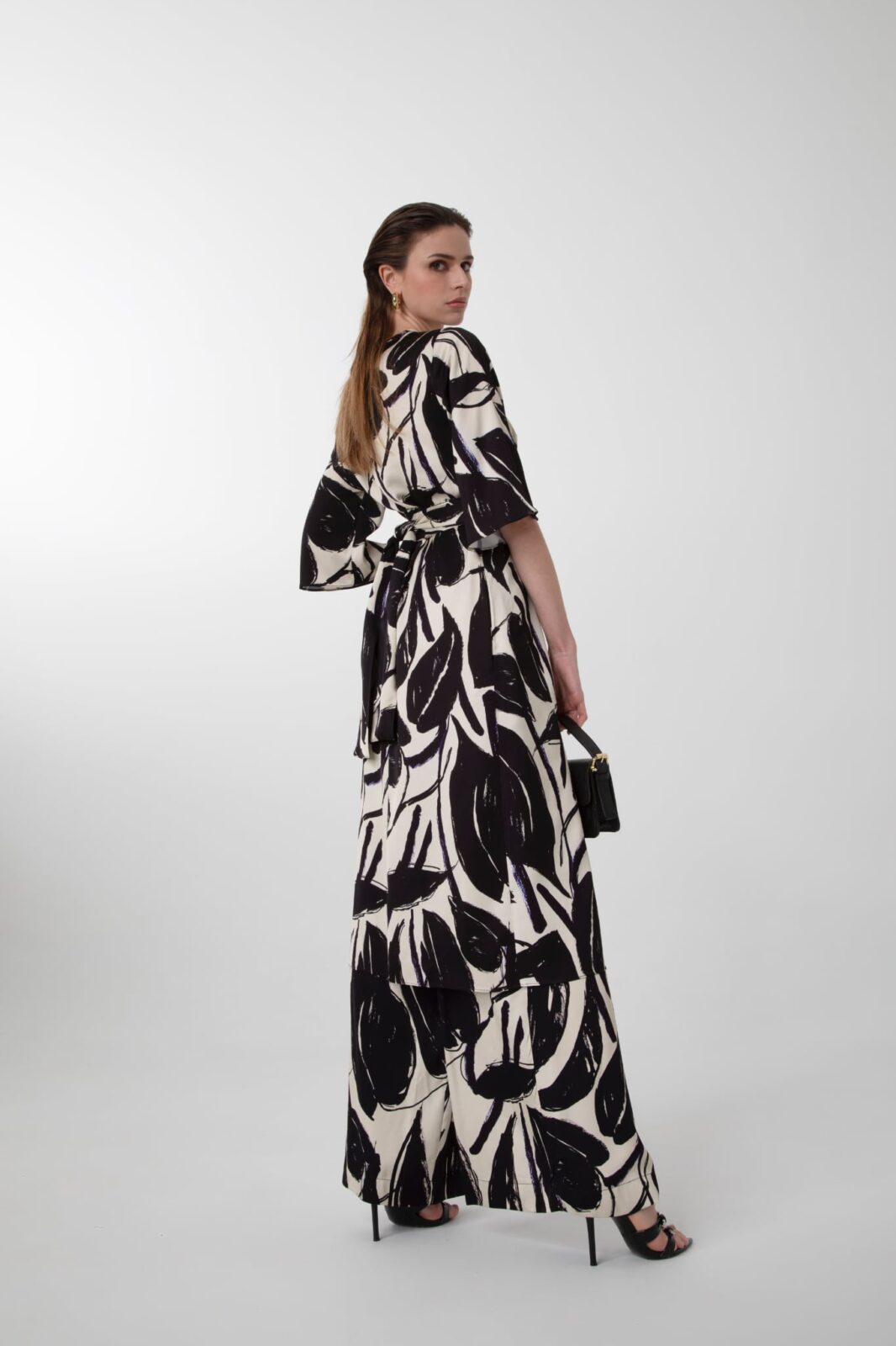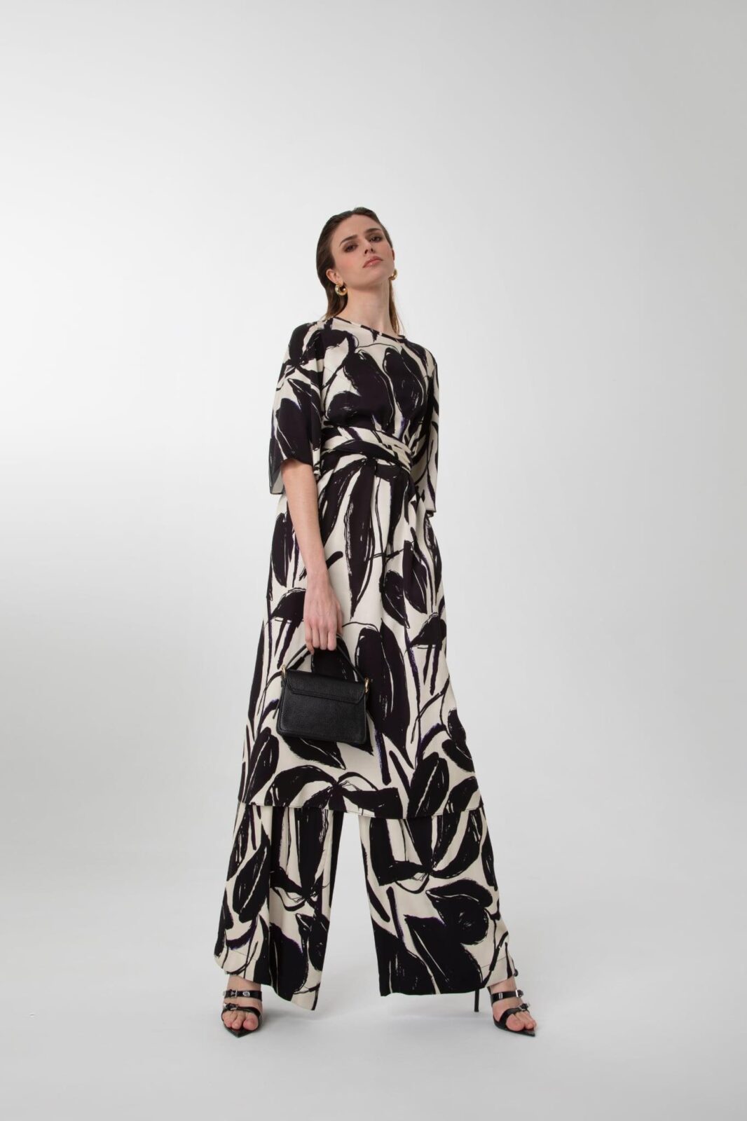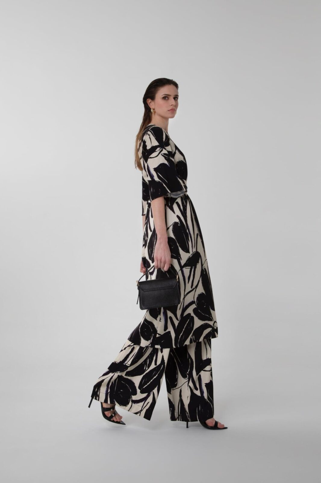 The minimalist floral print adds sophistication and freshness to the look. The wide cut ensures freedom of movement, while the waist belt accentuates the figure, creating a feminine silhouette.
