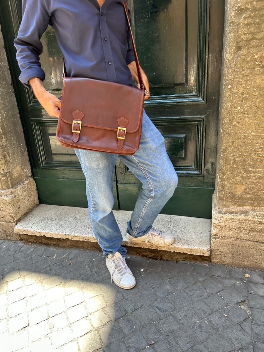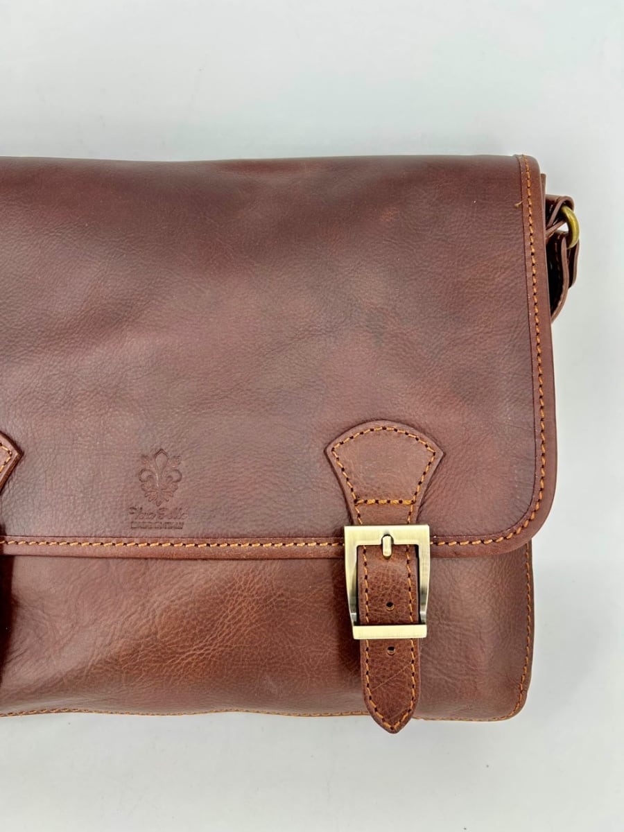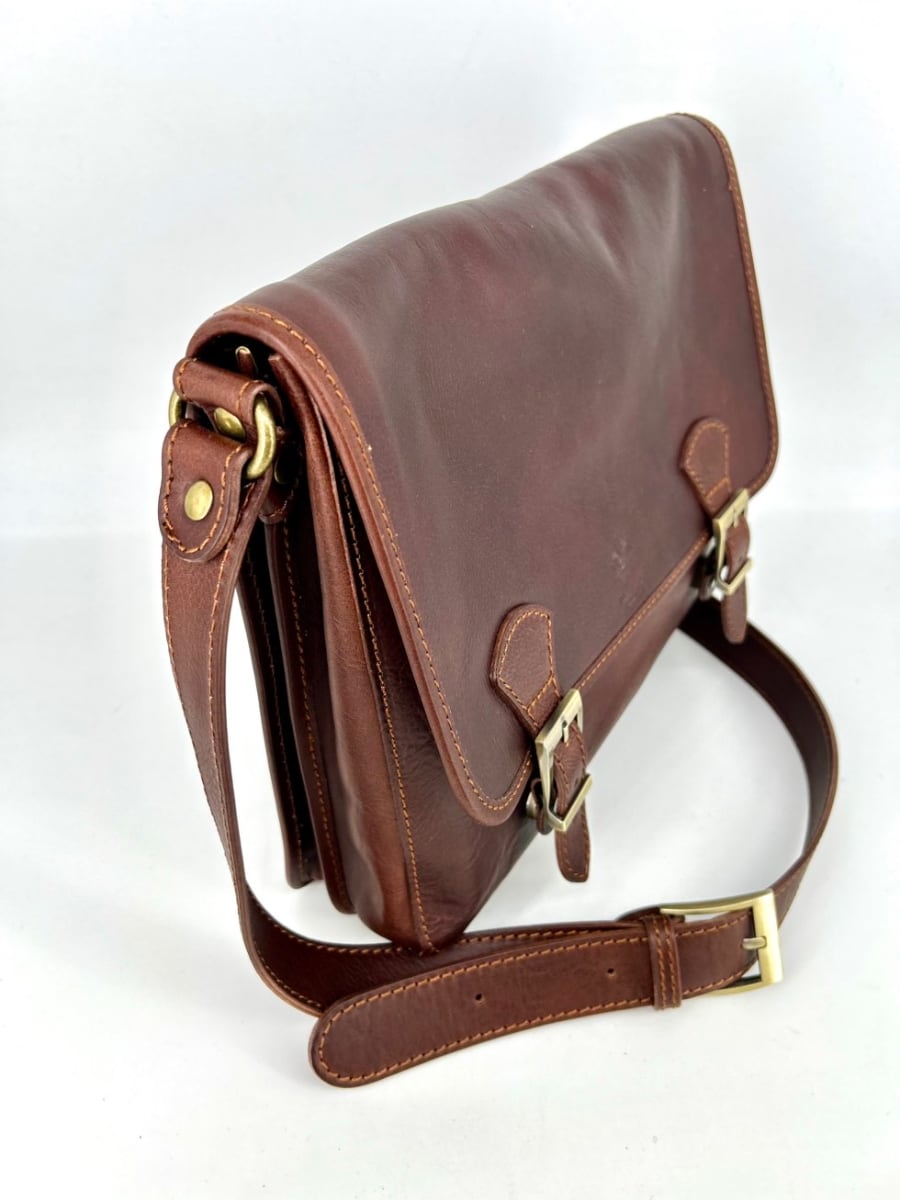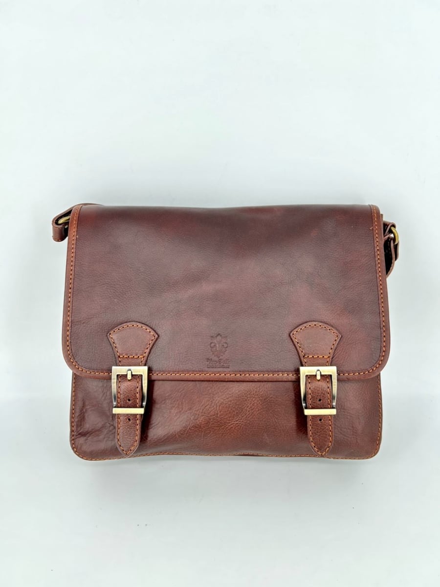 Practical oversized messenger bag. Made of aged and greased leather that is soft but thick and of excellent quality. Ideal for work and for walking. It has a good capacity, also suitable as a laptop, books, registers etc.