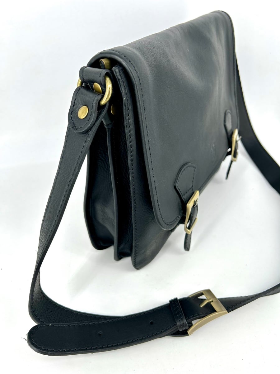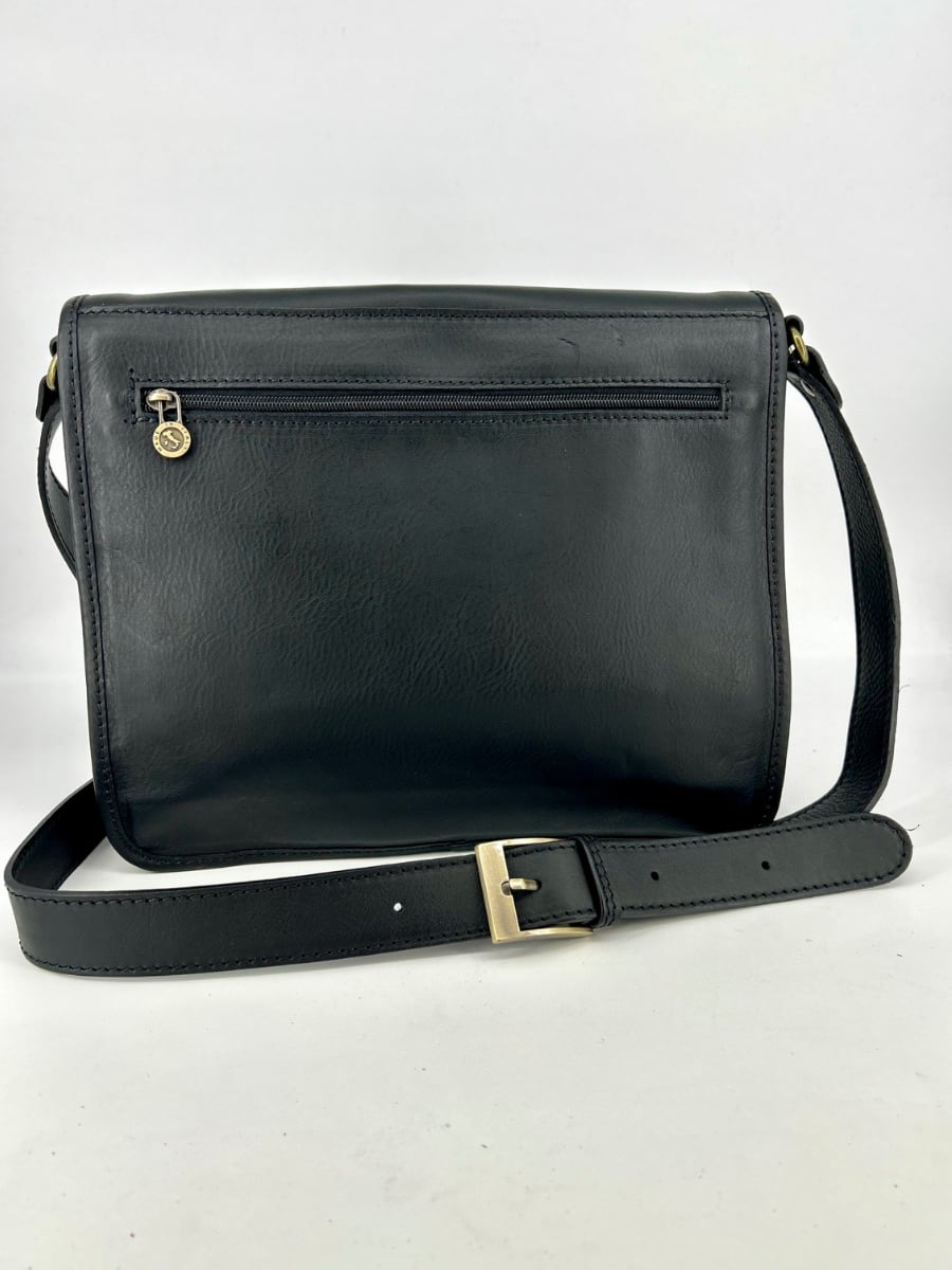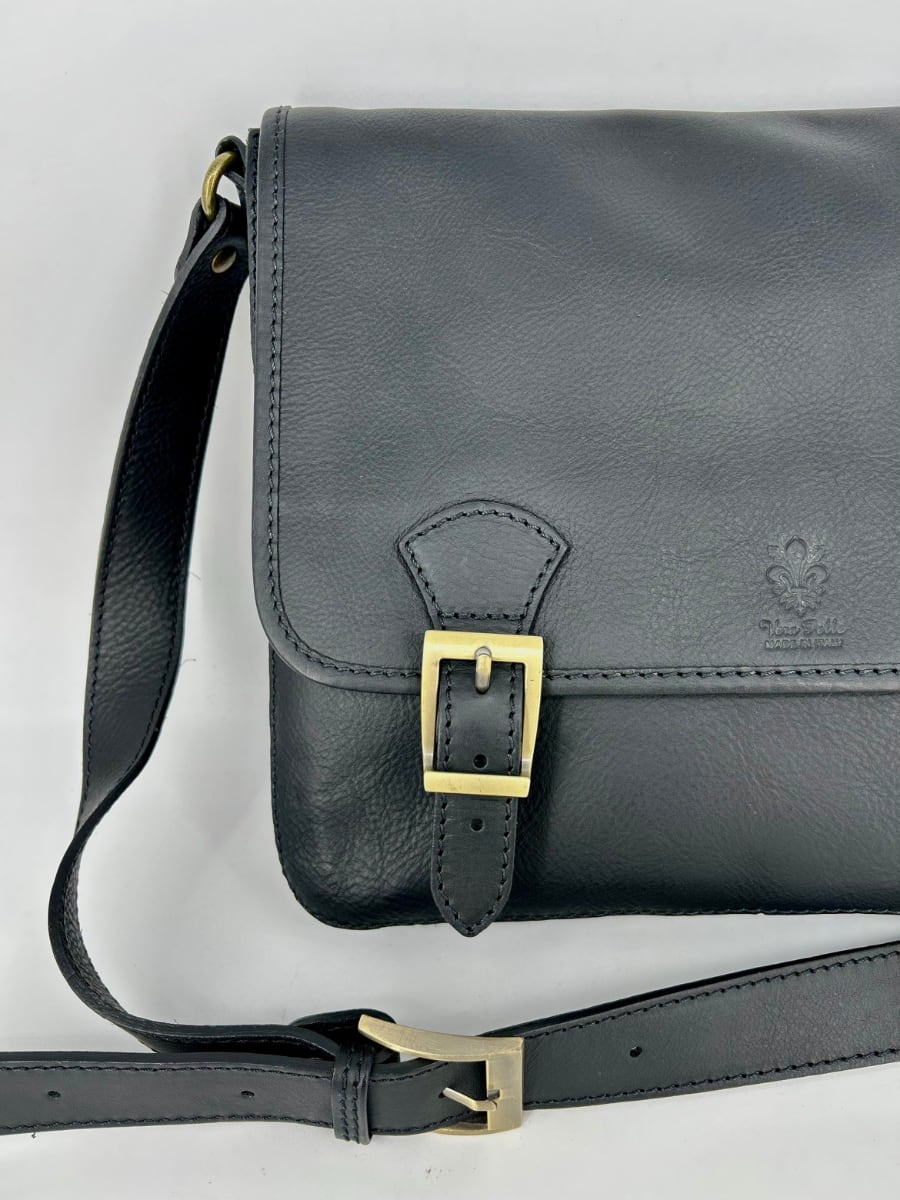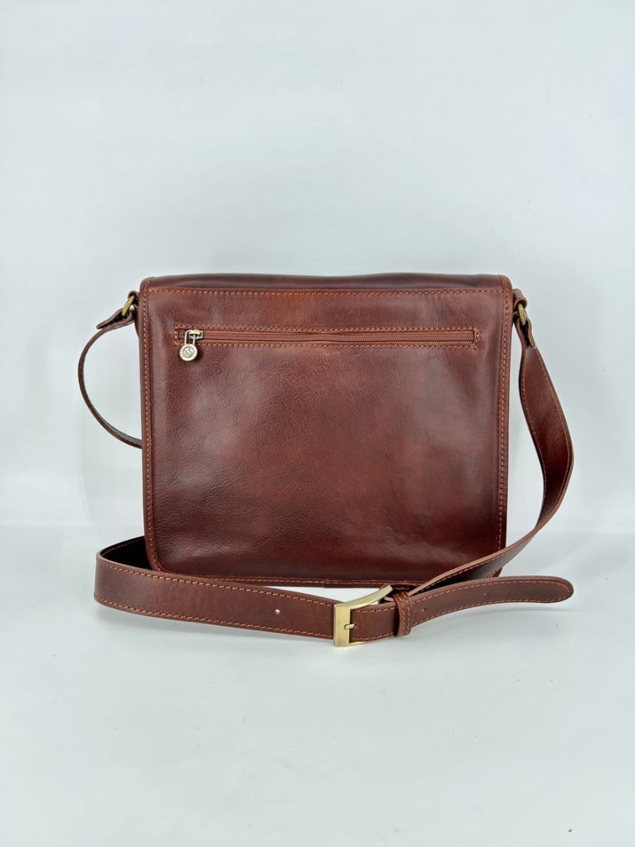Practical oversized messenger bag. Made of aged and greased leather that is soft but thick and of excellent quality. Ideal for work and for walking. It has a good capacity, also suitable as a laptop, books, registers etc.