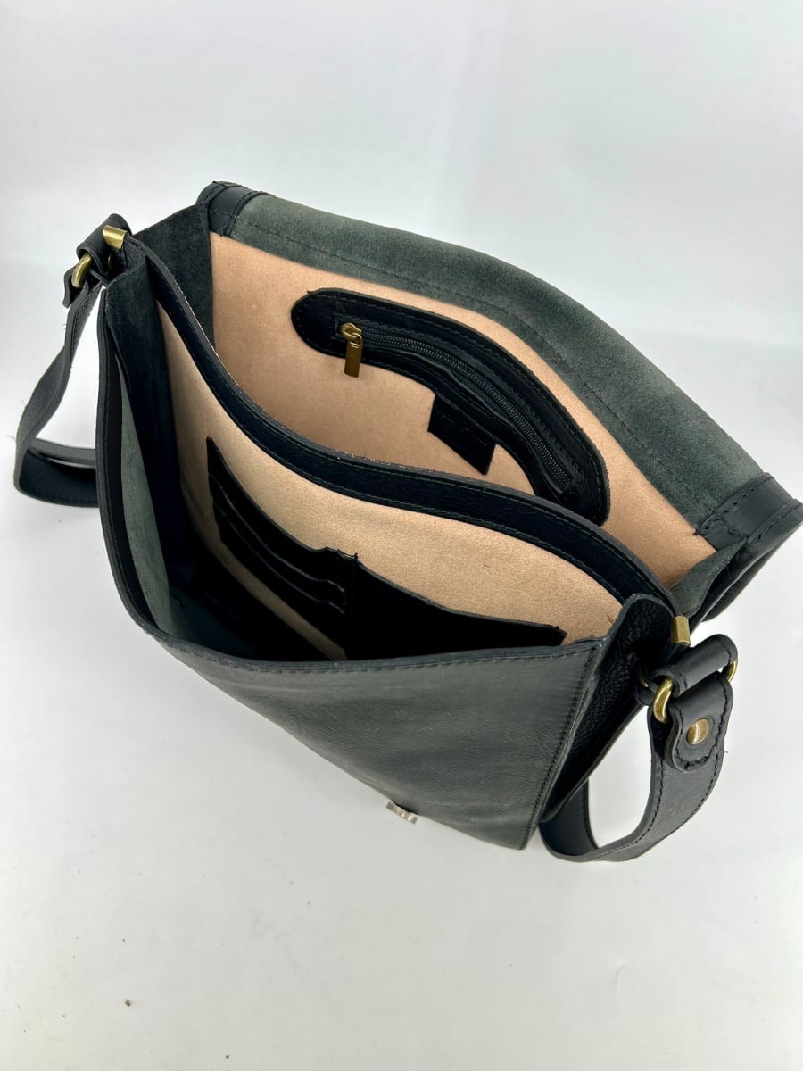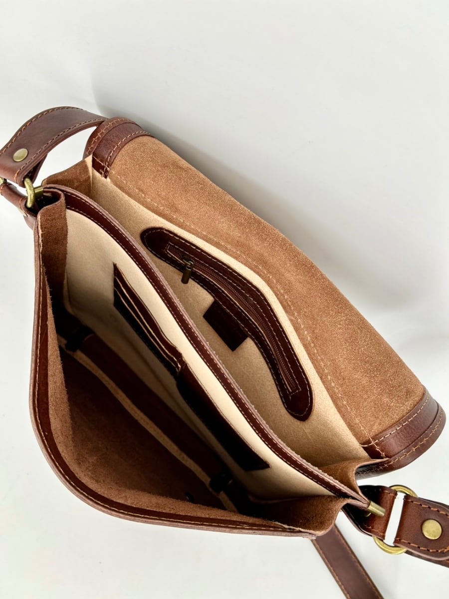 The interior is practical and functional, equipped with a large main compartment with magnets on the leather flap, closed by magnets on the leather lid in front of the main compartment, a small inner compartment.