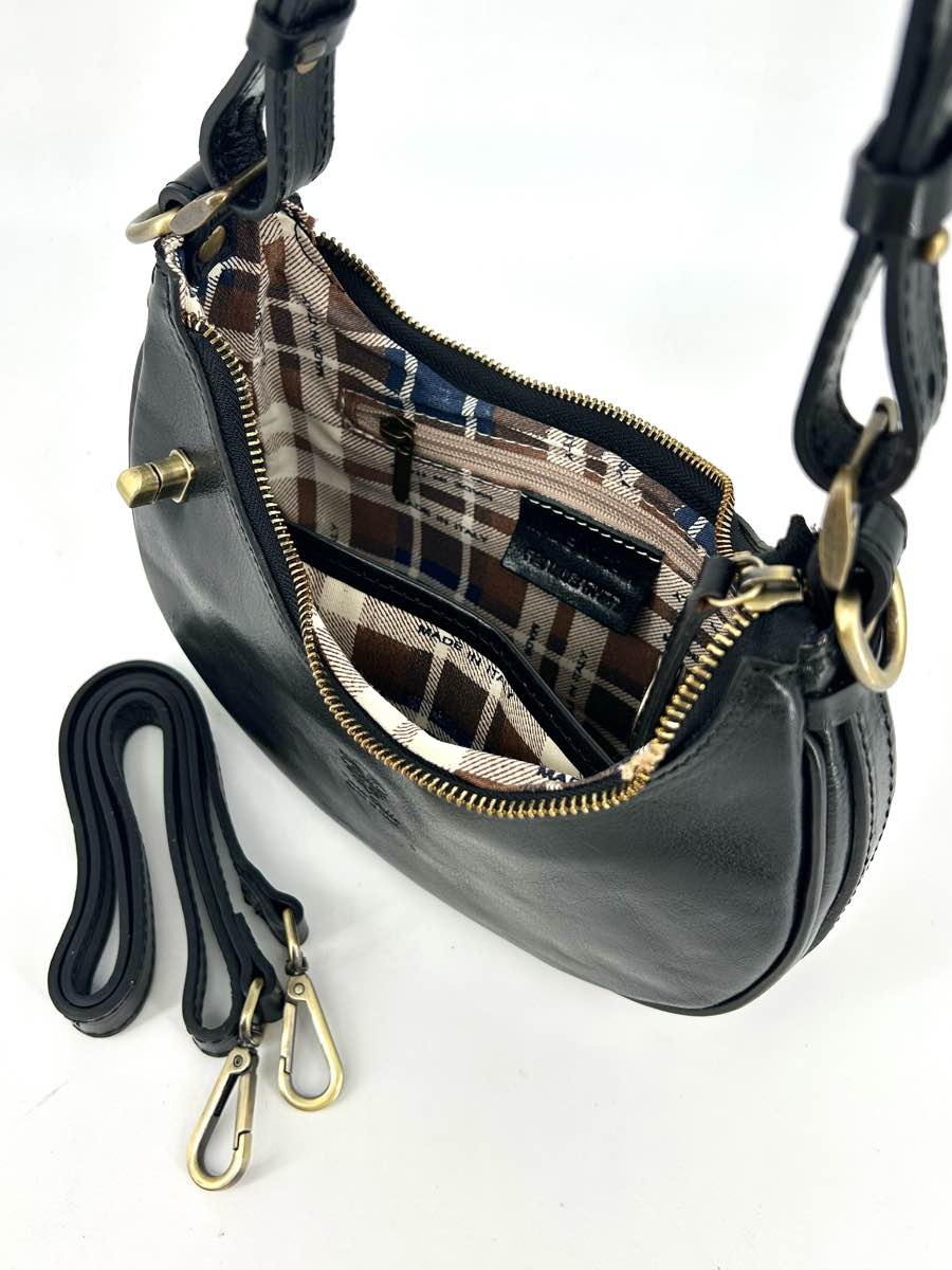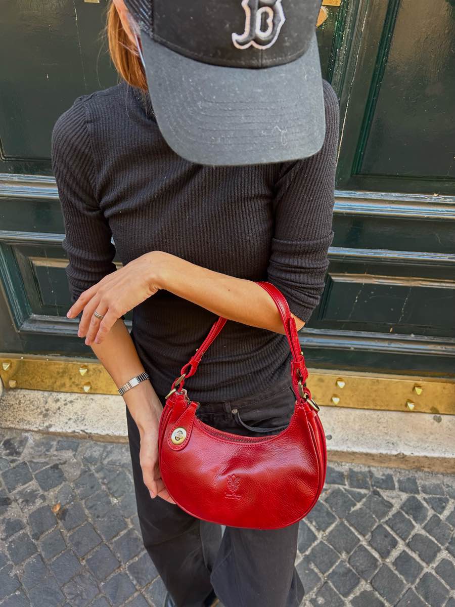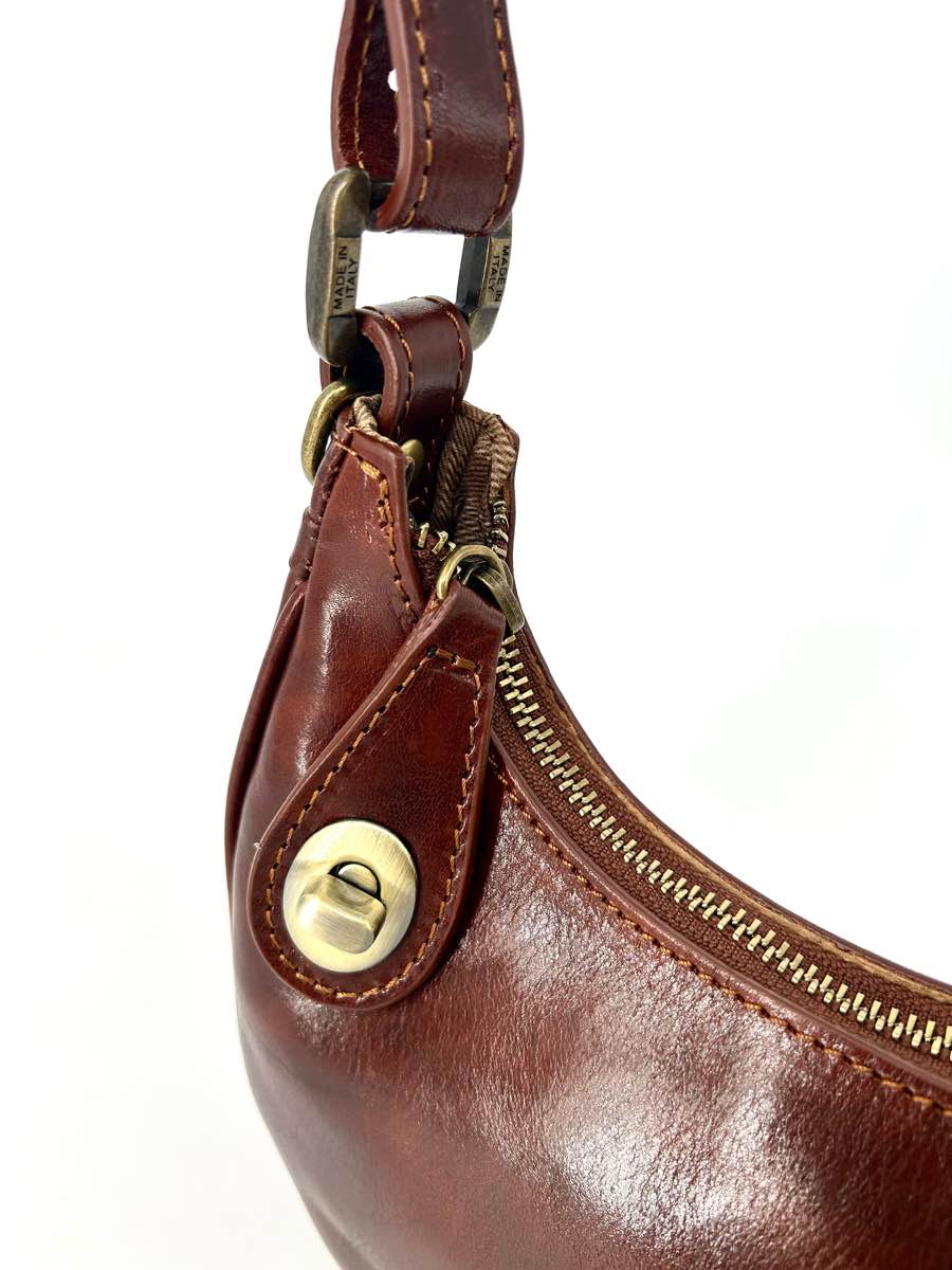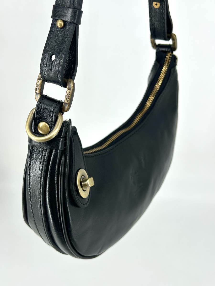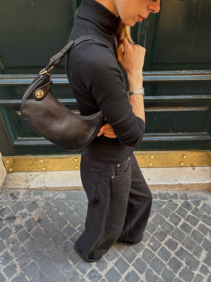 Genuine leather bag, half-moon shape, with zip closure and the option to secure the zip pull with a button on the front.