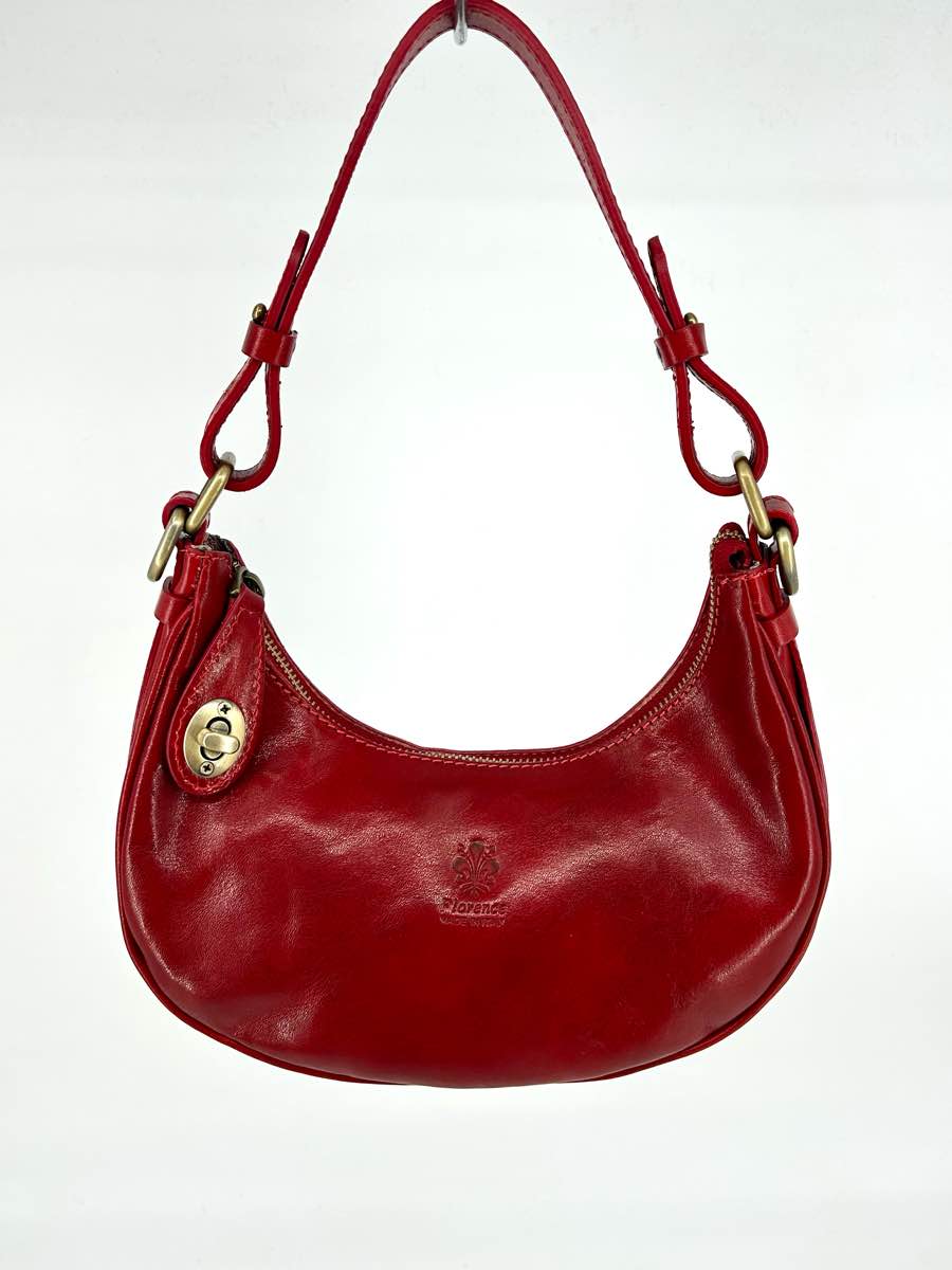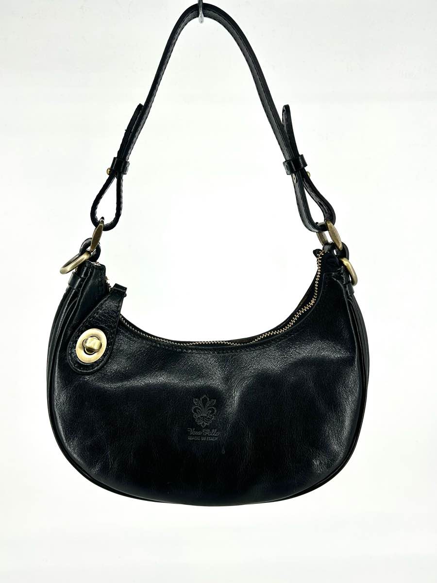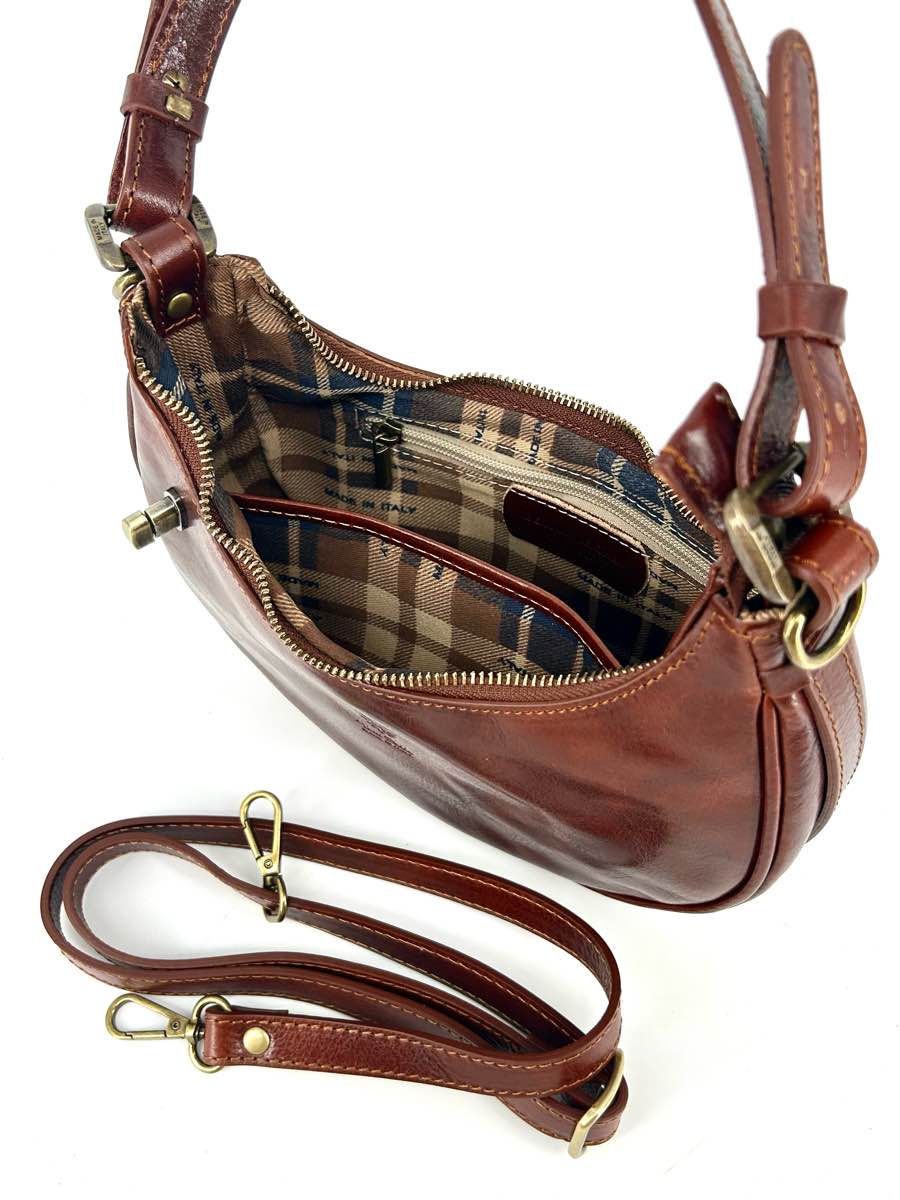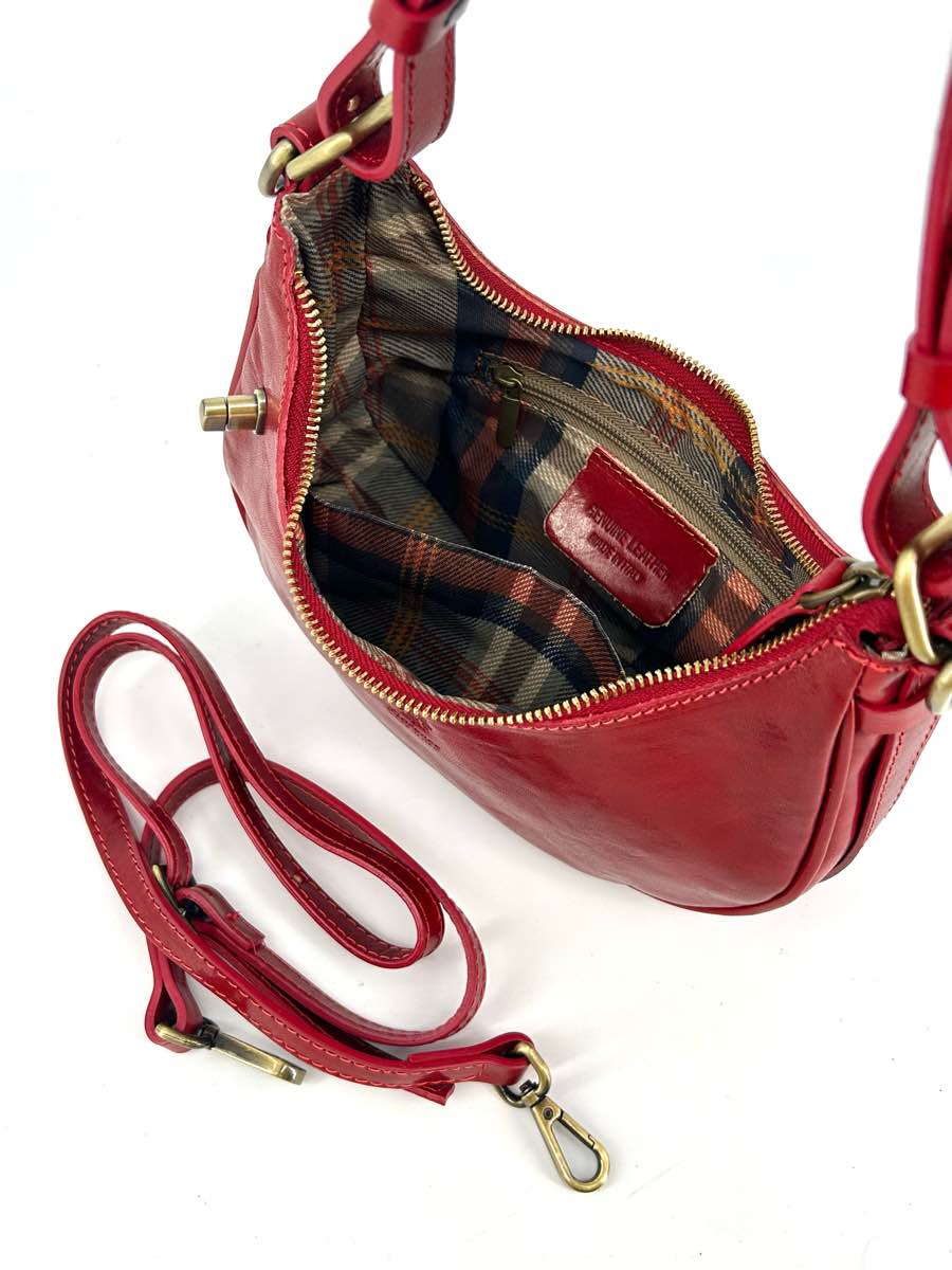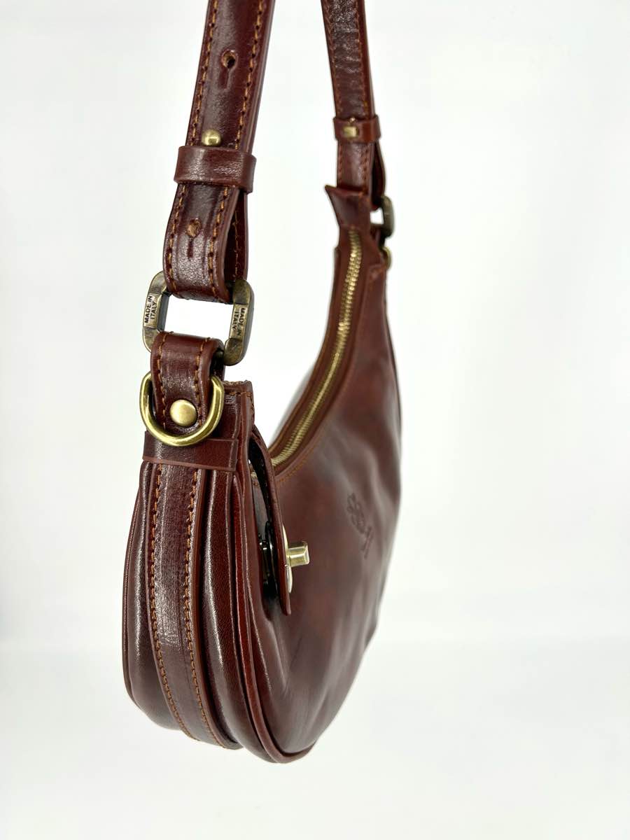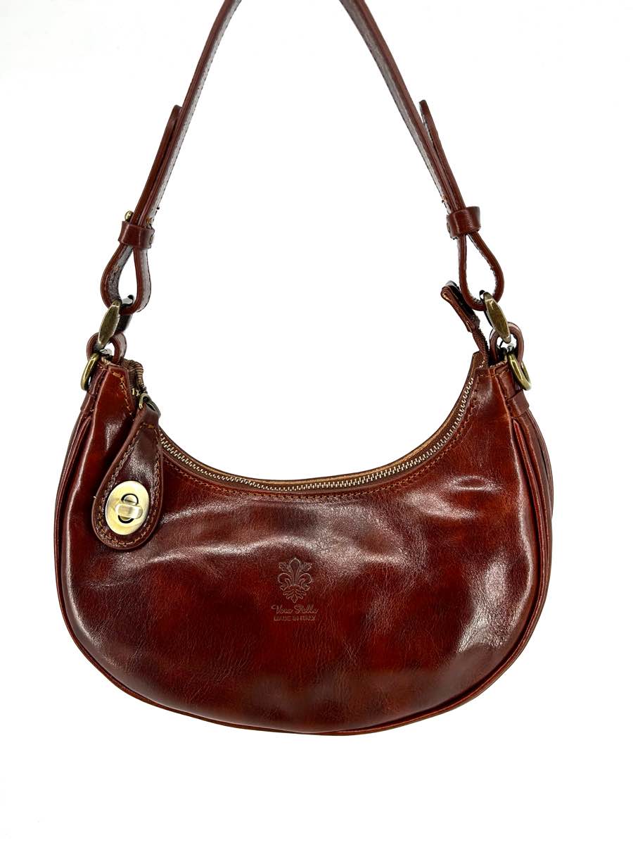 Genuine leather bag, half-moon shape, with zip closure and the option to secure the zip pull with a button on the front.