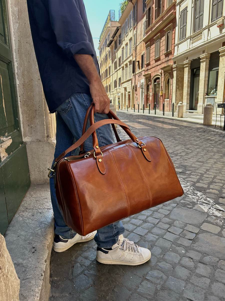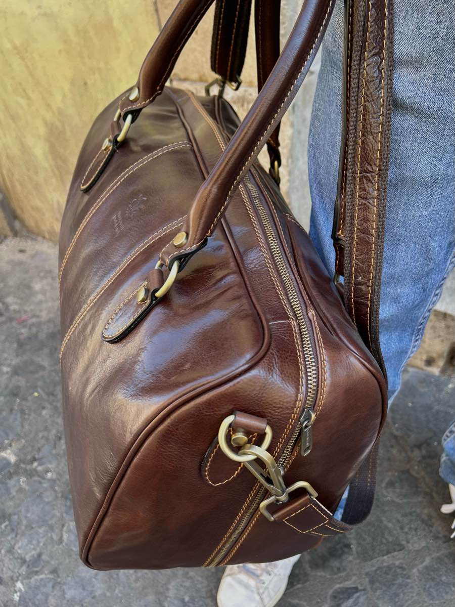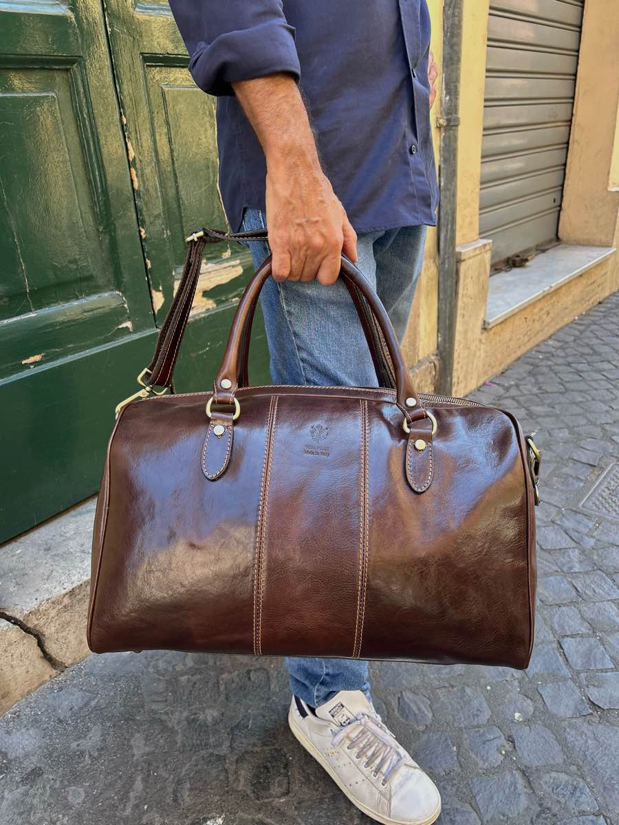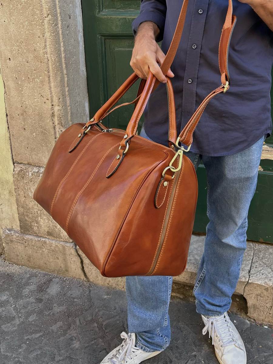 Large, unisex, cabin-sized cowhide leather travel bag.