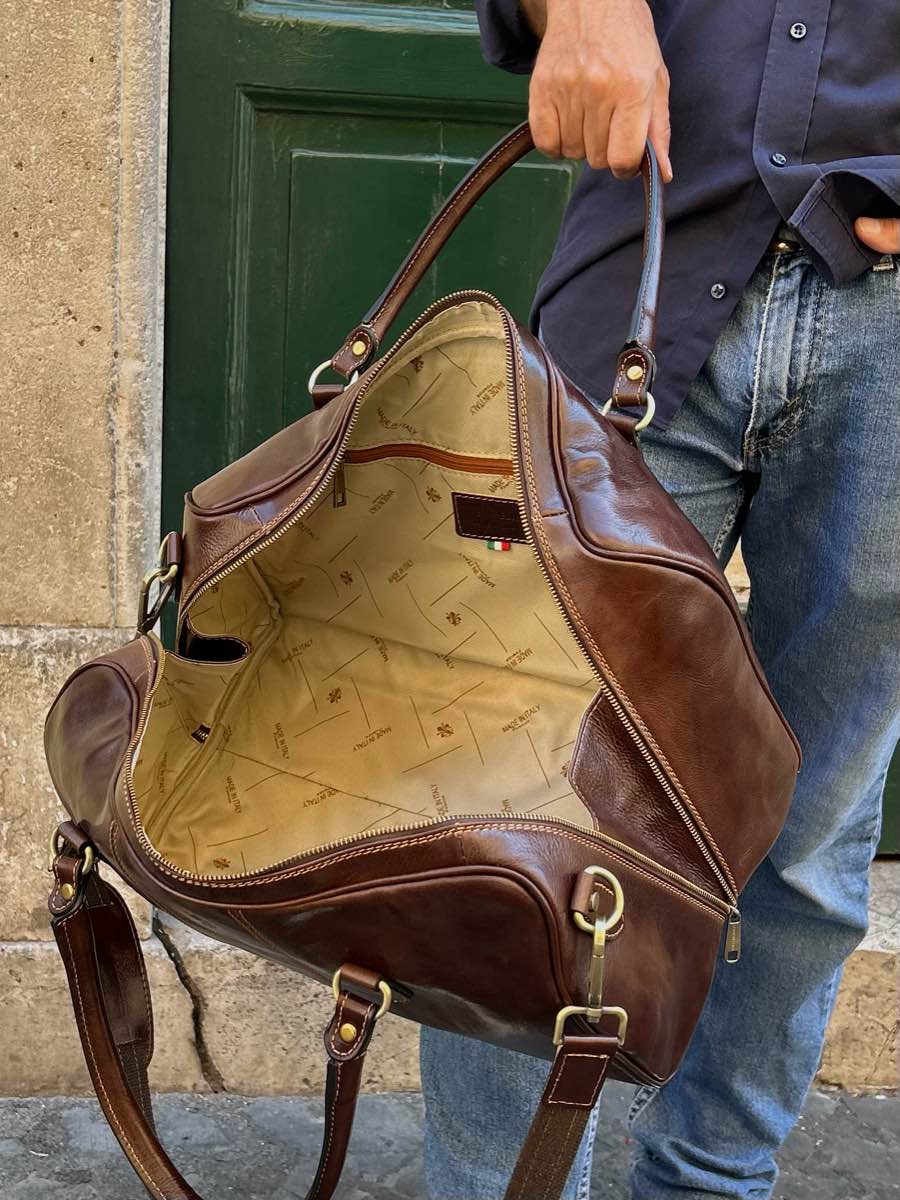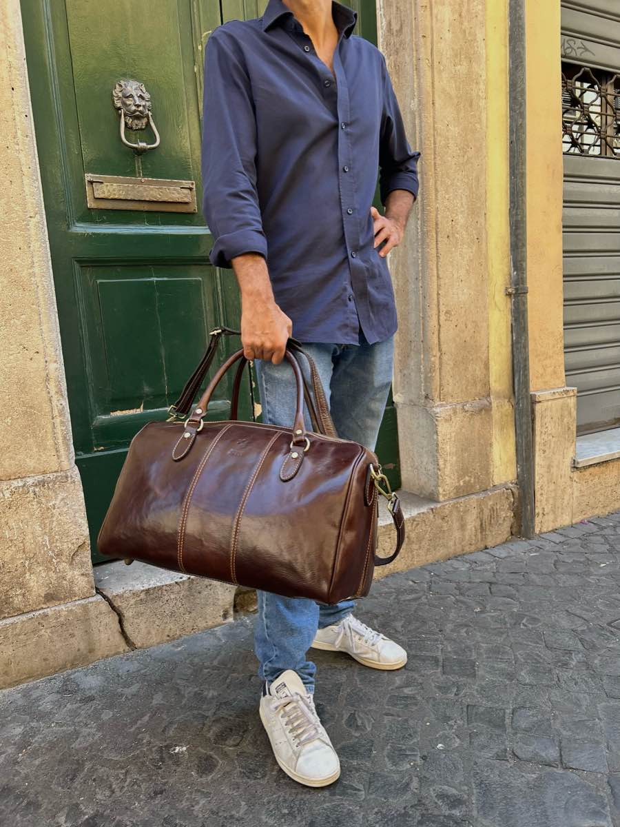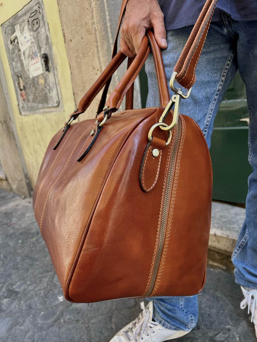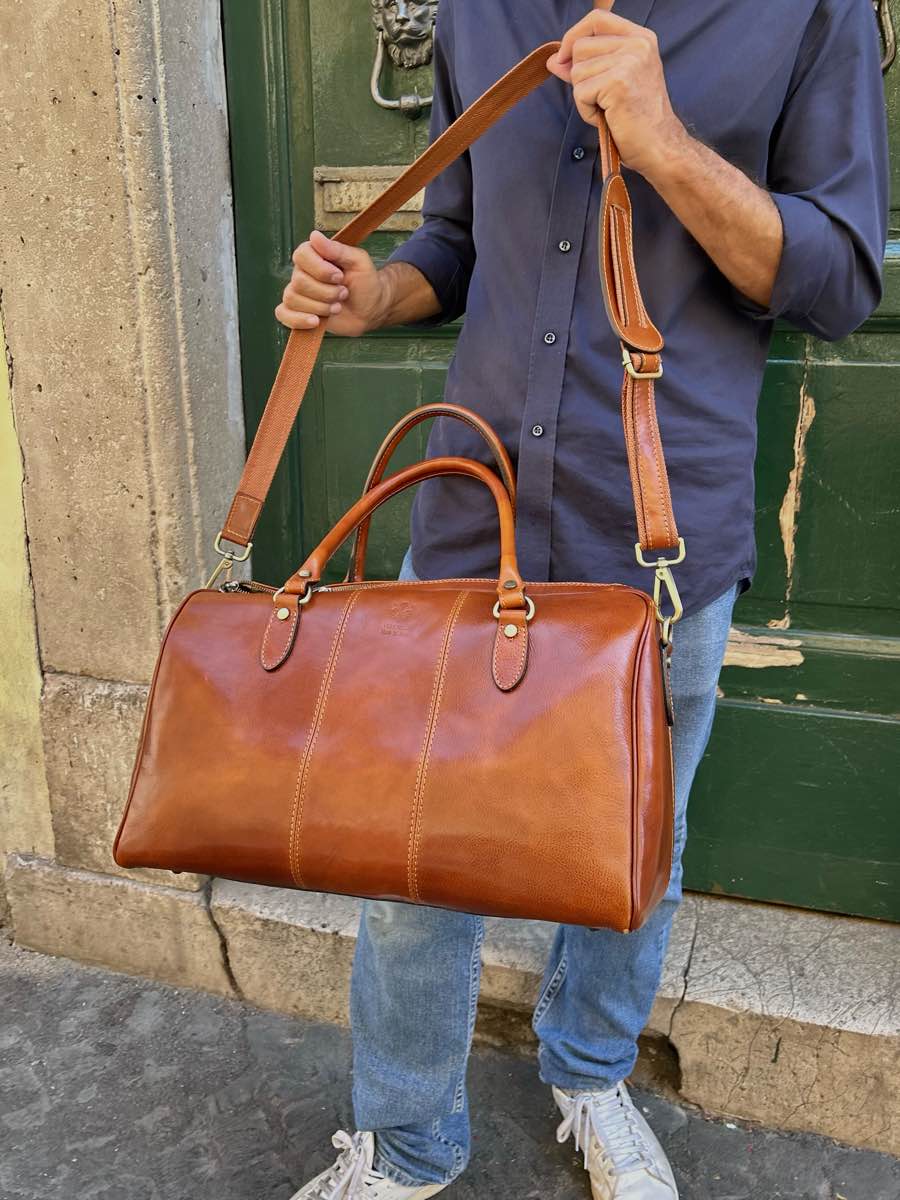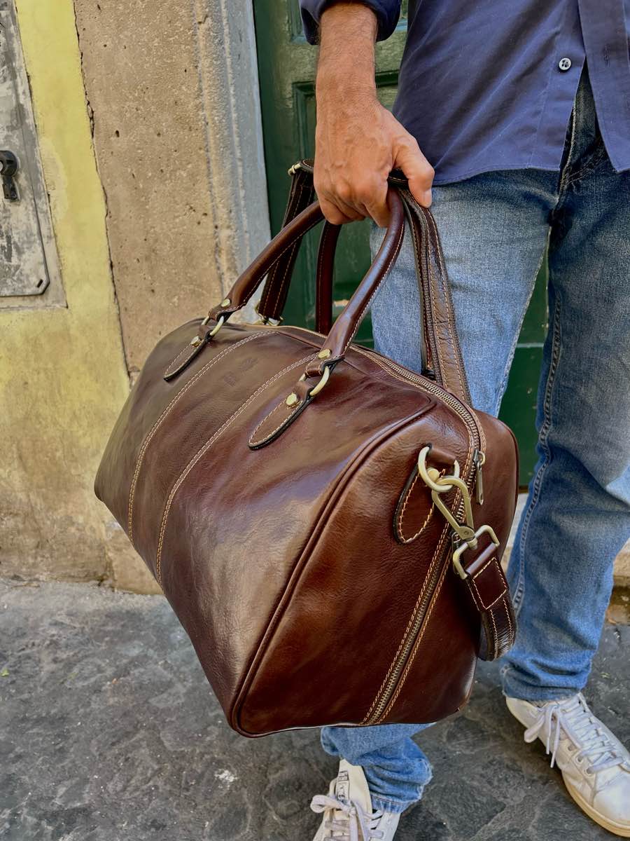 Large, unisex, cabin-sized cowhide leather travel bag.