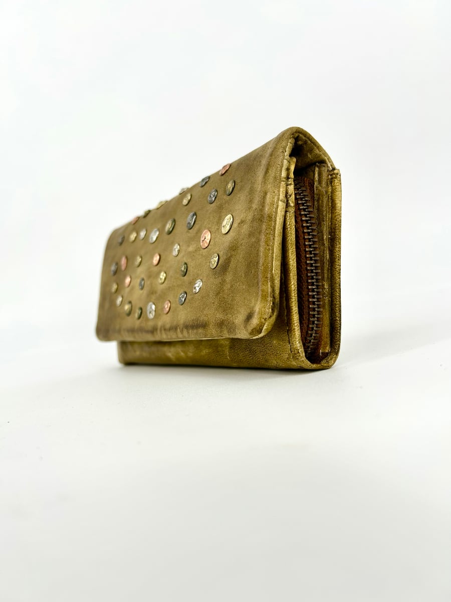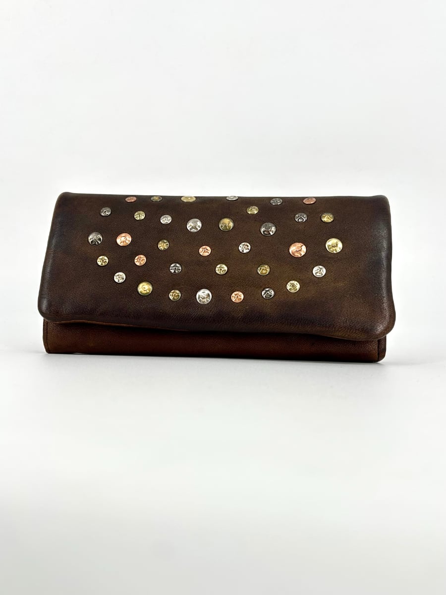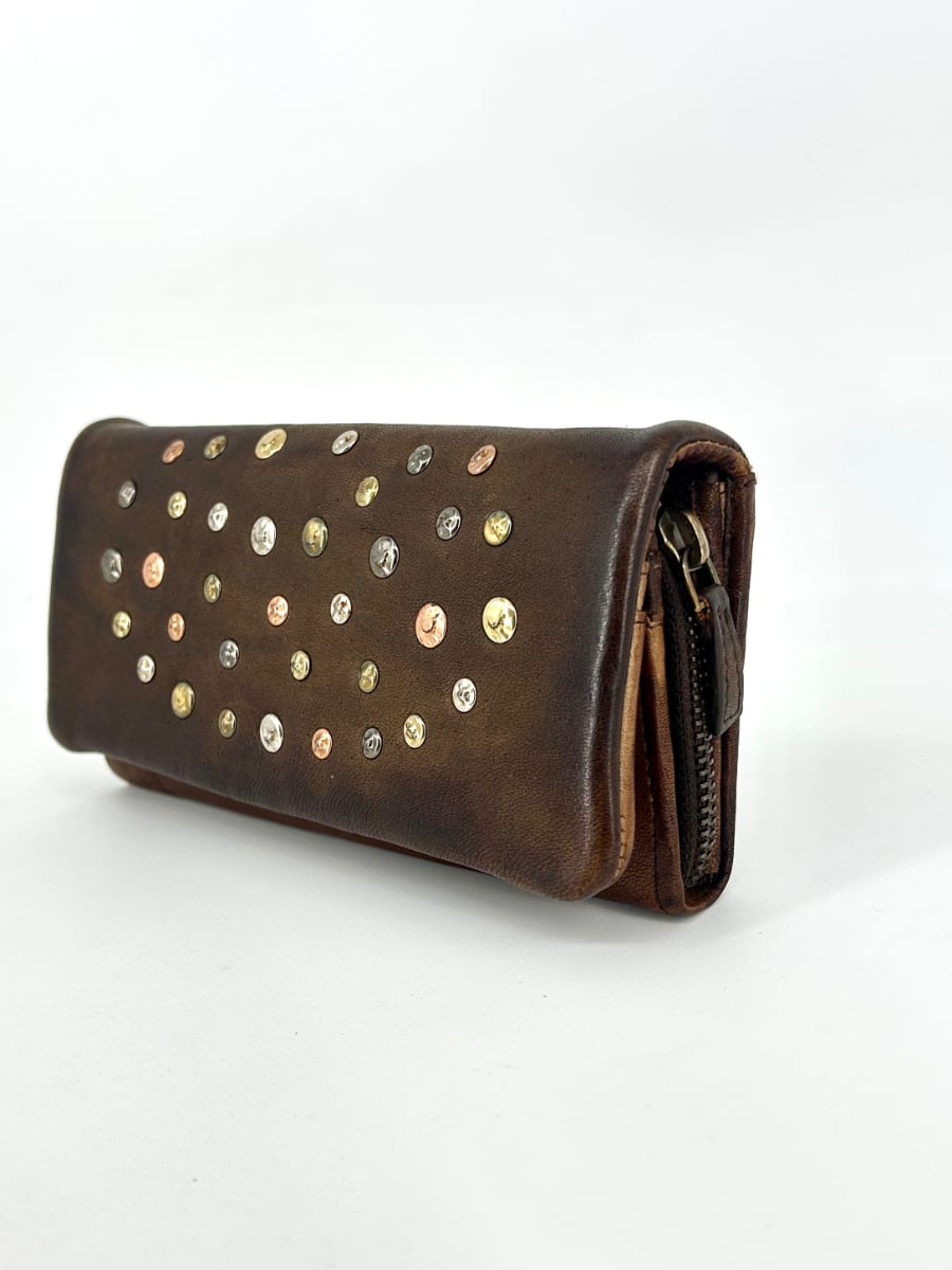 Unique and inimitable style given by the studded design and the choice of washed, untreated fur. Space for 18 cards, credit cards, space for banknotes, zip pocket for coins, 2 document compartments, quality of Italian craftsmanship.