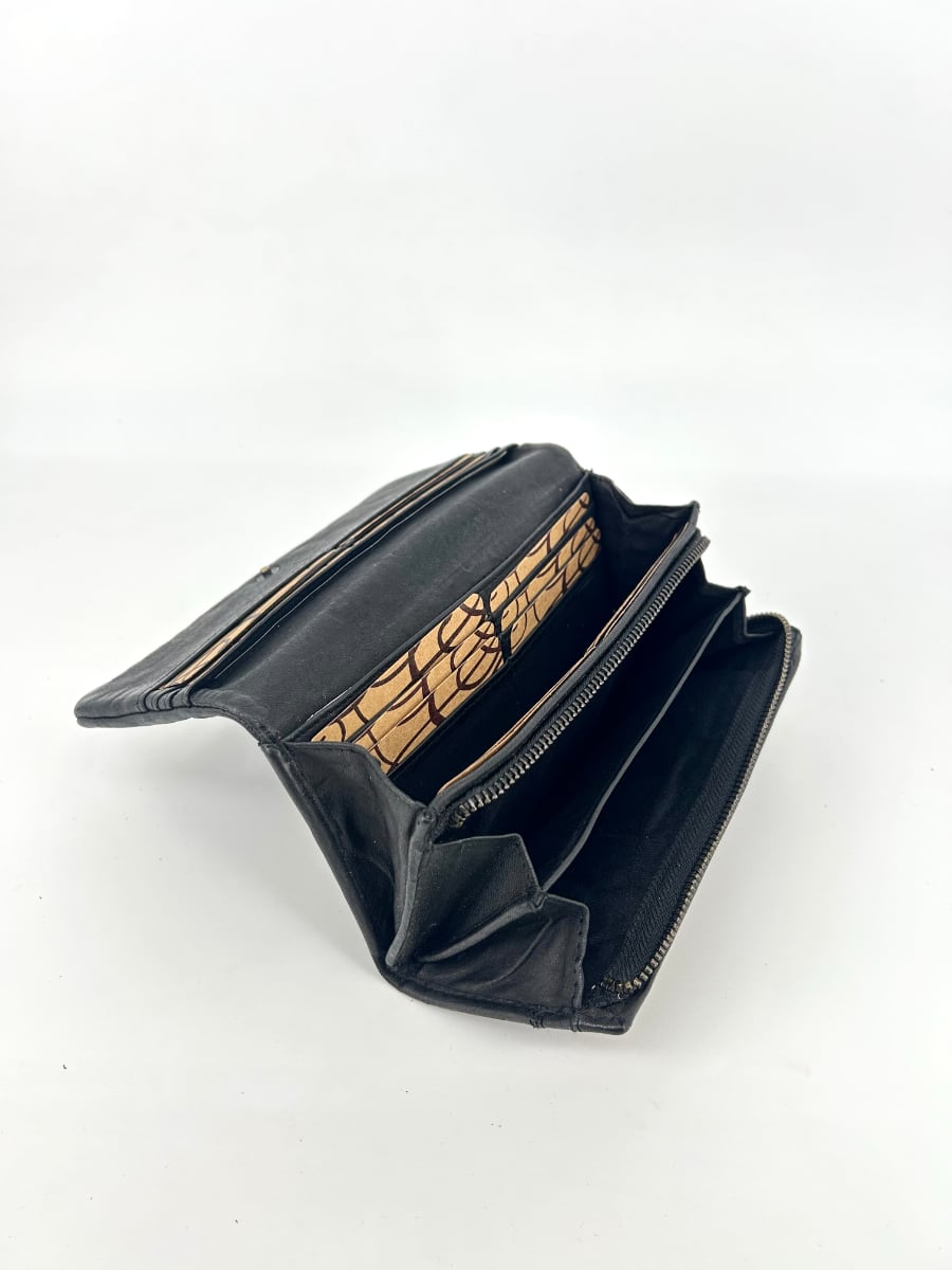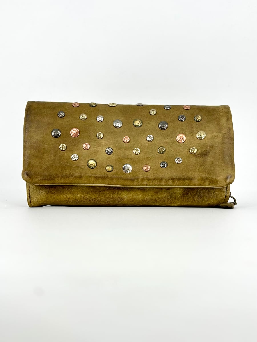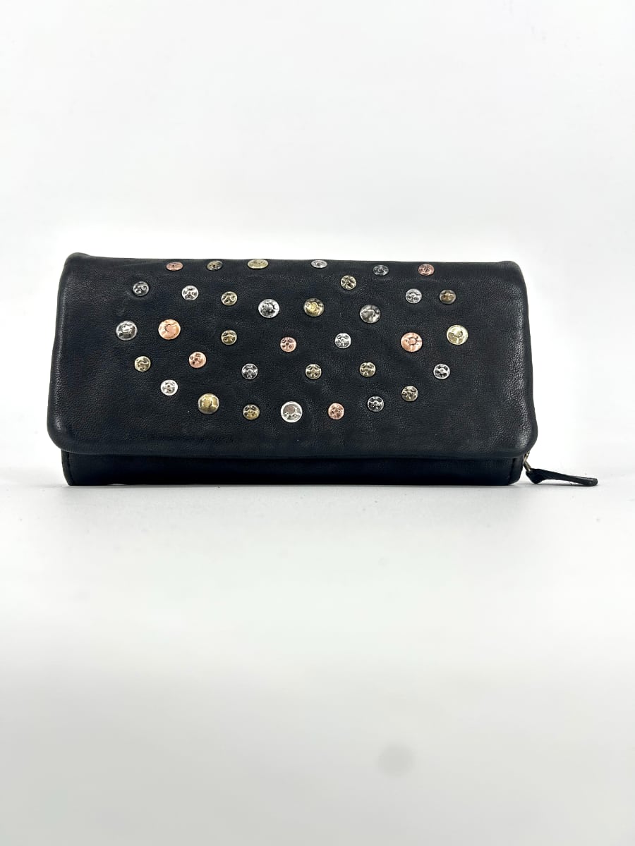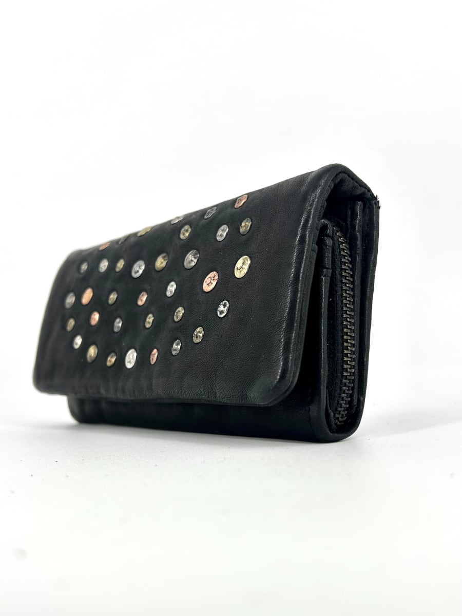 Unique and inimitable style given by the studded design and the choice of washed, untreated fur. Space for 18 cards, credit cards, space for banknotes, zip pocket for coins, 2 document compartments, quality of Italian craftsmanship.